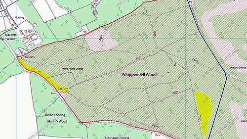Annual forestry works are taking place this week in Whippendell Woods. The work includes tree thinning in the area highlighted in yellow on the right-hand side of the map. The contractors will also do some path widening from the Rousebarn Lane car park to the corner of the wood by Jacotts Nursery end, shown in yellow on left-hand side of the map.